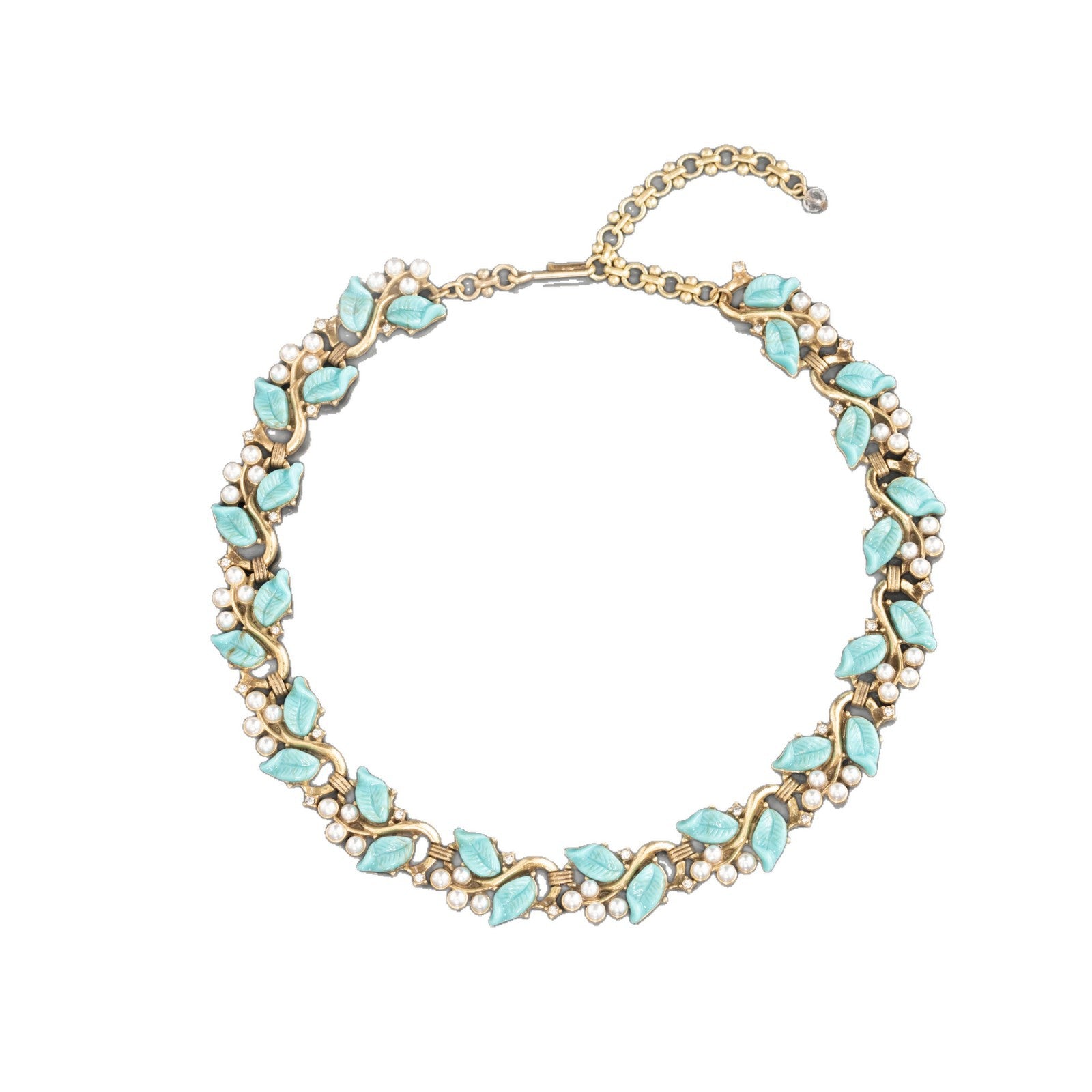 Inspired by mid-century botanical jewelry, this enchanting set pairs soft turquoise leaves with delicate ivory pearls, forming a garland-like silhouette that feels timeless, romantic, and effortlessly refined.