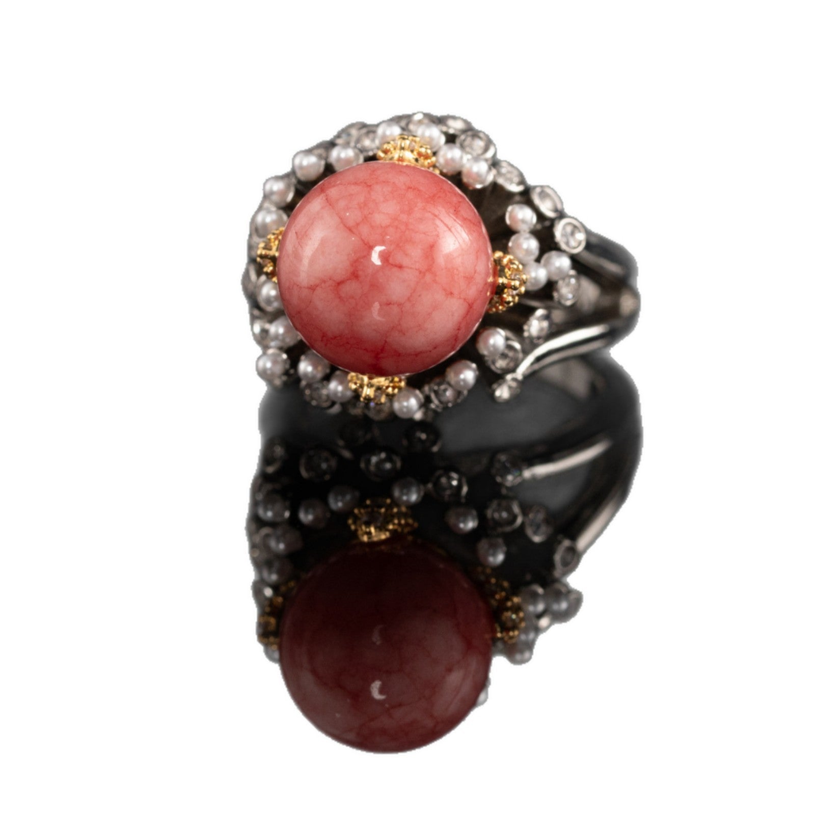 A romantic vintage-inspired ring featuring a rosy marbled stone framed by a delicate halo of petite pearls. The contrast of soft blush tones with luminous pearl accents creates a look that is both feminine and timeless. Golden bead details add a subtle touch of classic elegance, making this piece a refined statement for everyday wear or special occasions.